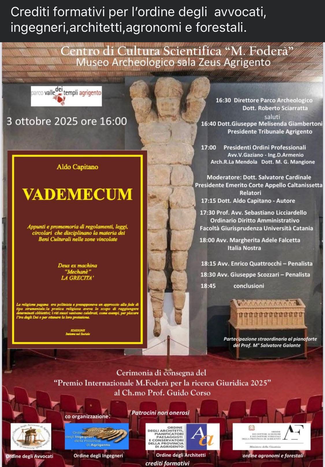 Venerdì 3 ottobre, alle ore 16:00, nella suggestiva cornice della Sala Zeus del Museo Archeologico Pietro Griffo – il Centro di Cultura Scientifica “Michele Foderà”,presenterà il volume del Dottor Aldo Capitano, dal titolo “Vademecum – Appunti e promemoria di regolamenti, leggi, circolari che disciplinano la materia dei Beni Culturali nelle zone vincolate. Deus ex machina “Mechanè” LA GRECITA’”.