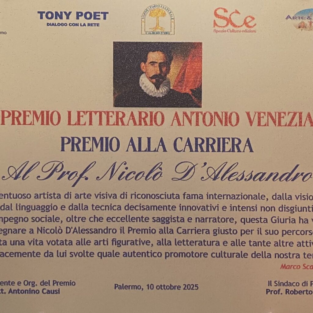 Venerdì 10 ottobre  al teatro della Consolazione di Palermo si è svolta la IV edizione del premio letterario “Antonio Veneziano”, organizzata dal  docente e poeta Antonino Causi. La serata è stata presentata dalla dr.ssa Marisa Palermo. Tra i premiati l’agrigentino Nicolò D’Alessandro e il realmontino Pascal Schembri  ideatore della “Casa del libro” e del prestigioso premio “Scala dei Turchi”. All’evento letterario era presente  il Dott. Giuseppe Mancuso vice presidente del consiglio Comunale di Palermo. D’Alessandro più conosciuto come pittore e grafico (storiche le sue immagini  che riproducevano primi piani di  protagonisti intervistati dal quotidiano “Repubblica”) si è fatto   apprezzare    anche come scrittore, tra l’altro, di “La lunga notte vuota”, “La carezza”, “Il guerriero persiano”, “Una estate a Buagimi”. Di seguito pubblichiamo alcune delle recensioni e i primi piani di Papa Francesco e Leone XIV”: “Abbiamo scoperto che quando la libertà viene negata, diventa la cosa più preziosa che possiamo avere ma può anche diventare la più grande conquista. Avvertiamo improvvisamente che ciò che prima ritenevamo scontato ora non lo è più.” Questa “Lunga notte vuota” va considerata come un interrogativo più che come la testimonianza di un periodo da dimenticare. Libro ricco di riflessioni, pensieri etici che portano ad analizzare la forza del silenzio, il senso pieno della vita. Il ricavato della vendita sarà devoluto interamente all’Associazione Volontari di Strada di Agrigento per l’acquisto di beni di prima necessità ai bisognosi.