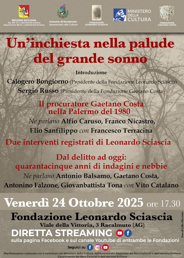 Il 24 ottobre, alle ore 17:30, la Fondazione Sciascia ospiterà il convegno “Un inchiesta nella palude del grande sonno”, organizzato insieme alla Fondazione Costa. Si discuterà del contesto storico e umano in cui operò il procuratore Gaetano Costa, figura centrale nella Palermo tra 1978 e 1980, ucciso il 6 agosto 1980 tre mesi dopo aver avuto il coraggio di firmare da solo, contro il parere dei sostituti che si occupavano dell’inchiesta, la convalida degli ordini di cattura contro esponenti di Cosa Nostra. A discutere saranno Alfio Caruso, scrittore e giornalista attento alla storia criminale d’Italia, Franco Nicastro, il cronista che scrisse della burrascosa riunione in procura nel 1980, ed Elio Sanfilippo, figura di spicco del Partito Comunista palermitano negli anni Settanta e Ottanta: testimonianze che, coordinate dal giornalista Francesco Terracina, restituiranno uno spaccato di quel periodo drammatico. Il pubblico ascolterà due interventi registrati di Leonardo Sciascia, documenti che arricchiranno ulteriormente la riflessione con lo sguardo critico e lucido dello scrittore siciliano. La seconda parte dell’incontro sarà dedicata a una riflessione sul lungo silenzio e sulle ombre che ancora oggi avvolgono questo delitto. Una conversazione con i magistrati Antonio Balsamo e Giovanbattista Tona, il nipote del procuratore assassinato Gaetano Costa, Antonino Falzone, uno degli avvocati che assistono la famiglia Costa, e Vito Catalano, nipote di Leonardo Sciascia: la discussione sarà un interrogarsi sulle inchieste finite in niente e sul perché, dopo tanto tempo, la verità su questo omicidio non sia mai venuta a galla. Ma forse è ancora possibile cercare di far luce su un mistero lungo quaranta cinque anni.