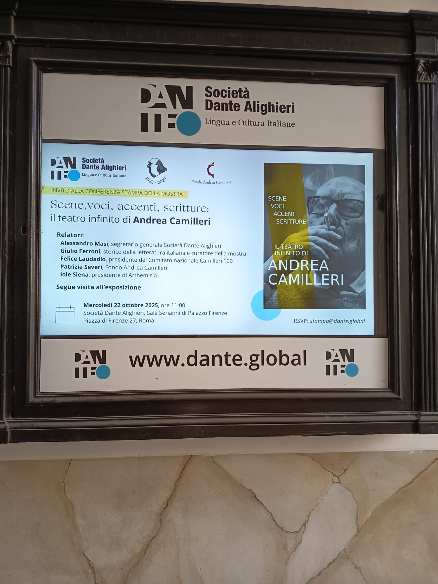 (di PAOLO CILONA)—È aperta al pubblico romano e non solo la mostra che riguarda il compianto scrittore e regista Andrea Camilleri. La mostra è stata organizzata dalla Società Dante Alighieri in collaborazione con il Fondo Andrea Camilleri, nell’ambito di un progetto di celebrazione del centenario della nascita dello scrittore. Una iniziativa importante che percorre le tappe di vita e professionali di Andrea Camilleri. In bella vista quaderni, appunti, foto giovanili, le copertine dei libri di scuola, le sue poesie. Un pannello spiega egregiamente la continuità del suo impegno e della sua passione culturale e artistica, che nell’opinione corrente vengono di solito ricondotte al formidabile successo del suo tardo esordio di narratore e alla sua vena creativa. Come dichiarò lo stesso Andrea Camilleri, è stato il teatro la sua vera passione. Un teatro “infinito”, perché tutto il molteplice operare di Camilleri lo ha visto percorrere la scena, concepire l’esistenza, i rapporti interumani, l’orizzonte sociale, la coscienza culturale e l’espressione artistica entro una prospettiva, appunto teatrale. Camilleri nel corso della sua vita ha inseguito, sperimentato e plasmato il teatro in tutte le forme e con tutti i supporti possibili:dalla gestione della scena teatrale all’intreccio tra visione, movimento, architettura, corporeità, vocalità e gestualità. Ha agito in prima persona nell’interesse del teatro drammatico con le cosiddette arti “sorelle” pittura, scultura e musica e con i media della modernità novecentesca (radio, televisione e cinema). Nella sua narrativa emerge un teatro quasi del tutto siciliano. Una mostra davvero interessante che porta il visitatore a conoscere da vicino uno dei più importanti personaggi del XX secolo ovvero Andrea Camilleri l’ideatore del commissario Montalbano.