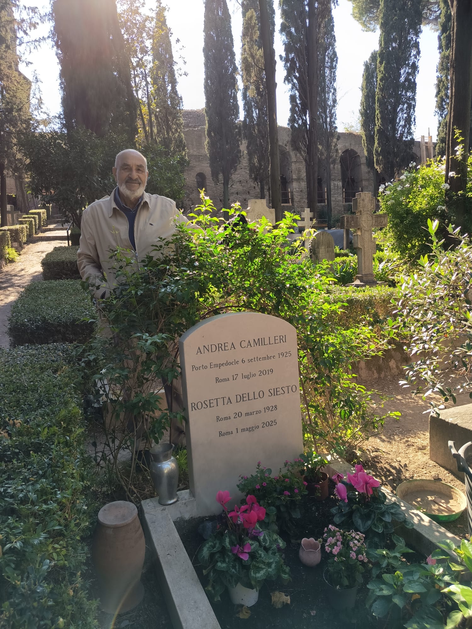 (di PAOLO CILONA)—Sono andato a trovarlo come e’ mia abitudine quando mi trovo nella città dei Papi e dei Cesari a deporre un fiore sulla tomba di Andrea Camilleri al cimitero acattolico dove e’ sepolto. E proprio nel centenario della sua nascita ho trovato la sua tomba dove adesso è in compagnia della diletta moglie Rosetta Dello Siesto, morta quest’anno nel mese di maggio. Andrea non e’ più solo ed e’ in buona compagnia. Uniti nella vita assieme nella tomba, luogo del riposo eterno situato presso la Piramide di Caio Cestio, circondato dalle mura Aureliane.