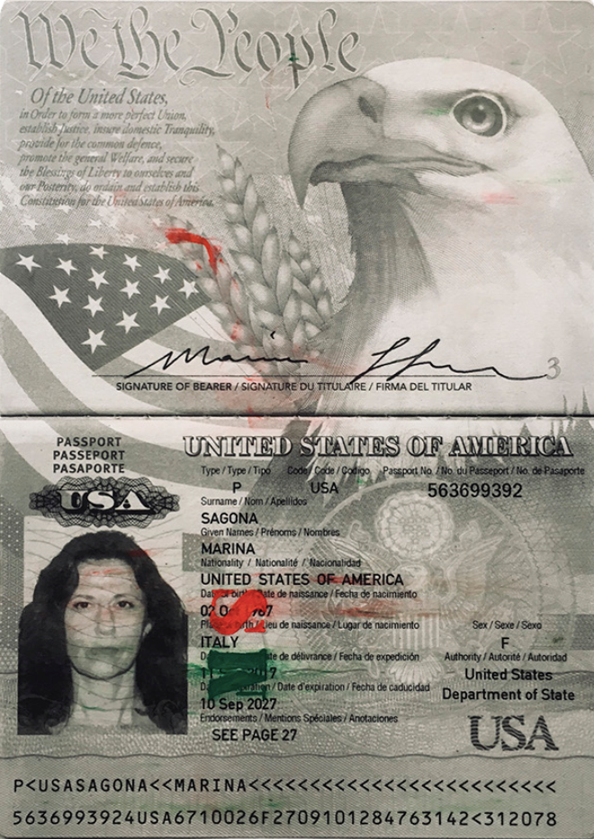 Il Diritto di sangue [Ius Sanguinis] recita che chi dimostra di possedere un po’ di sangue italiano nelle vene, può diventare cittadino del Belpaese. Anche se non parla la lingua, se non ne conosce la cultura, se non è mai stato in Italia. Il Rovescio di Sangue è l’esatto contrario: è il percorso (spesso lungo e difficile) che deve seguire chi quel sangue non ce l’ha, ma vuole diventare italiano, parla la lingua, conosce le regole del Paese, ci vive da quando è nato. Marina Sagona in un progetto video [20 minuti, canale unico, sottotitoli di Anna Camilleri e Ian Richard] racconta storie di migrazione di stranieri e straniere verso l’Italia, e di discendenti italiani all’estero alla ricerca delle proprie origini. Di contro, attraverso Passport 2019 [14 stampe carta Hahnemühle matte, con interventi di pastello ad olio] ecco l’acquisizione della cittadinanza per naturalizzazione legata al lavoro, da parte di un’italiana all’estero (la stessa Sagona). Sono due rotaie parallele che alimentano la discussione, ma non il dialogo.