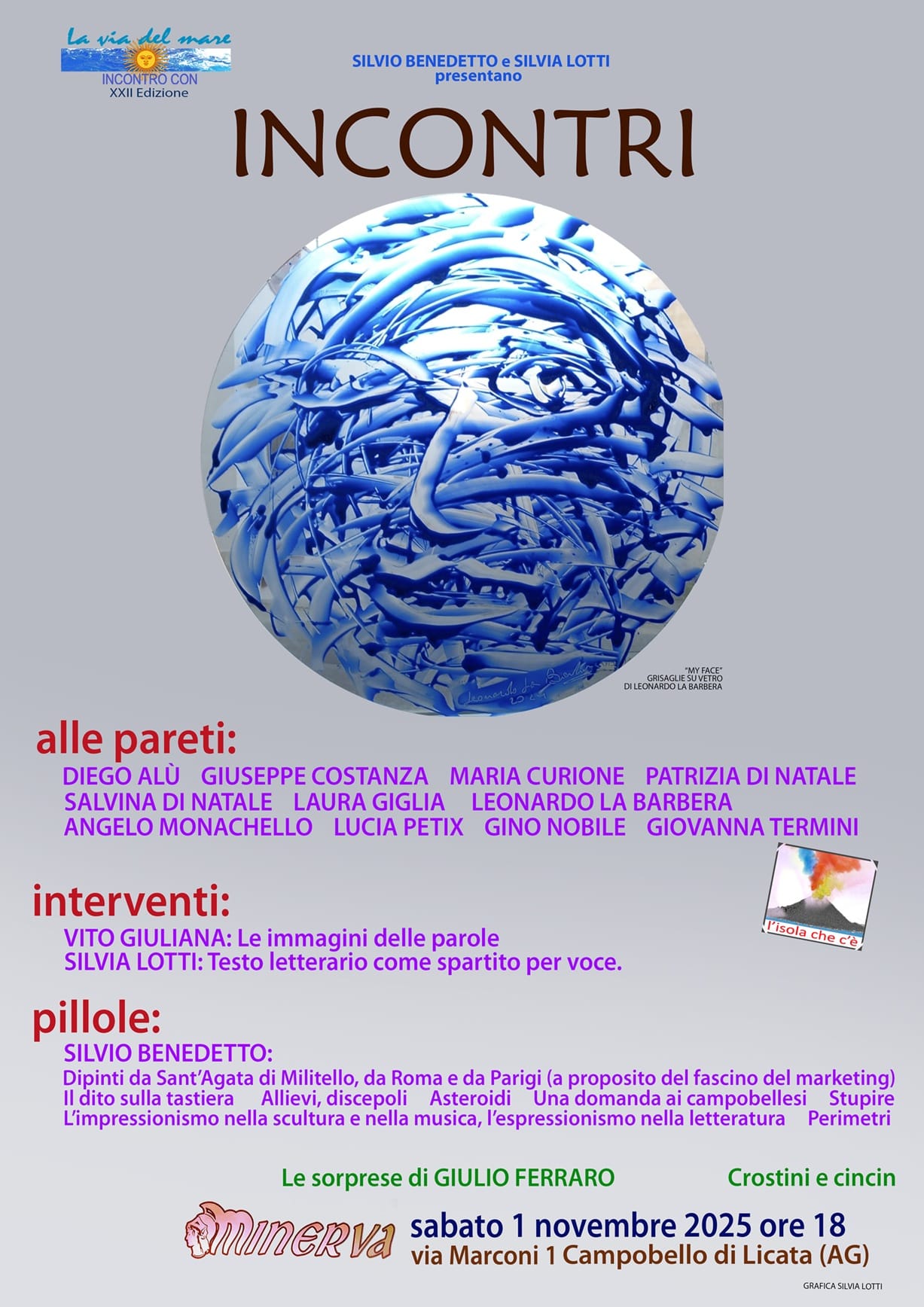 Un bel programa vi attende per sabato 1 novembre: Lo scrittore Vito Giuliana e Silvia Lotti interverranno sul tema ‘Immagine visiva nella scrittura’. I pittori parleranno delle loro esercitazioni sull’espressionismo e Leonard La Barbera esporrà una sua opera in cristalli mentre Silvio Benedetto sarà presente con le sue tradizionali e acute polemiche: ‘Pillole’. Dunque un programma da non perdere ma anche un’ occasione di scambio di idee e soprattutto un’ opportunità di conoscere il maestro Silvio Benedetto nella Saletta Minerva, via Marconi 1, Campobello di Licata (AG) ore 18,