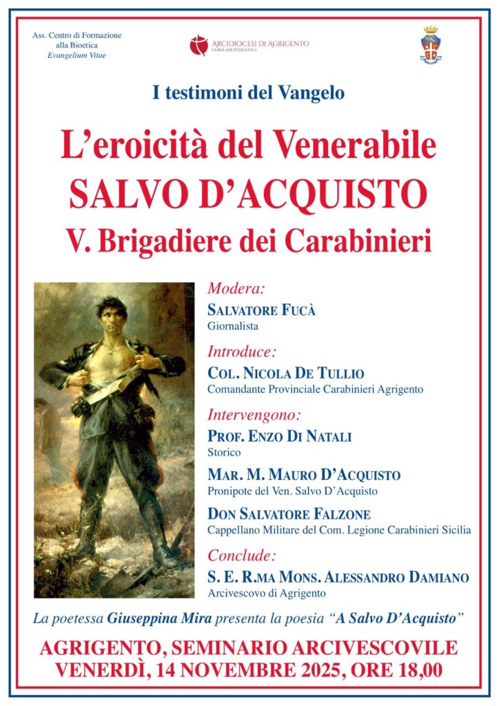 (di Paolo Cilona)–Nel Seminario Vescovile di Agrigento è stata  ricordata la nobile figure di Salvo D’Acquisto, l’Eroe di Palidoro. All’incontro  moderato dal giornalista Salvatore Fucà sono intervenuti il Comandante Provinciale Carabinieri di Agrigento Col. Nicola De Tullio, lo storico prof. Enzo Di Natali, il pronipote dell’Eroe, Maresciallo M. Mauro D’Acquisto e Don Salvatore Falzone, Cappellano Militare del Comando Legione Carabinieri della Sicilia. Le conclusioni sono state affidate all’Arcivescovo di Agrigento Mons. Alessandro Damiano, che ha ricordato l’eroicità del Venerabile Salvo D’Acquisto V. Brigadiere dei Carabinieri, testimone del Vangelo. Una importante iniziativa da parte dell’Arma che non ha mai dimenticato l’eroe di Palidoro. La memoria come disse Cicerone è tesoro e custode di tutte le cose. Chi si occupa del presente non può prescindere del passato. Il Vice Brigadiere Salvo D’Acquisto aveva indossato la divisa non per compiere atti di eroismo ma per servire l’Italia con impegno e dedizione e di espletare fino in fondo il proprio dovere di Carabiniere. Di certo non voleva entrare nel Tempio della memoria dove albergano i nomi degli eroi e dei martiri di ogni tempo. Si scopri eroe senza volerlo, e per di più senza saperlo. “ Era il 23 settembre 1943 quando, a seguito di un attentato alle Schutzstaffeln (SS) naziste, dove trovarono la morte due soldati, il comando tedesco prese in ostaggio 22 cittadini italiani innocenti, scelti a caso fra gli abitanti di Torre Palidoro. Il Comandante del contingente tedesco, per dare una parvenza di legalità al sequestro operato, cercò di coinvolgere il Carabiniere più elevato in grado per affidargli il compito di individuare un colpevole tra i 22 presi in ostaggio. I tedeschi allora aggredirono  Salvo D’Acquisto, giovane Vice brigadiere di soli 23 anni in sottordine alla vicina Stazione di Torre in Pietra, cercando di convincerlo ad accusare qualcuno, ma non servì a nulla. Il Vice Brigadiere infatti, intuendo le intenzioni dei nazisti, decise di  autoaccusarsi, sacrificando la propria giovane vita in cambio di quella dei 22 innocenti”. Famose rimasero le sue ultime parole: “Se muoio per altri cento, rinasco altre cento volte, Dio è con me ed io non ho paura”. Triste è quel Paese che ha bisogno di eroi. La vita quotidiana di una comunità secondo Claudio Magris non dovrebbe avere necessità di uomini eccezionali, pronti se necessario a mettere in gioco la propria esistenza; sembrerebbe logico poter vivere, lavorare, amare, gioire  senza per questo dover essere disposti a morire o a rischiare la vita. Ma quando c’è  bisogno di eroi, solo un Paese che ne ha può sperare di salvarsi. Lo slancio  altruista di Salvo D’Acquisto contribuì a ridare luce e fede ad altre coscienze umane. Da Carabiniere considerò il dovere come una nobile missione  quasi a ricalcare quel fervore mistico con cui i primi catecumeni si offrirono al martirio .Presso  la Congregazione delle Cause dei Santi è in corso  il processo di canonizzazione di Salvo D’Acquisto.