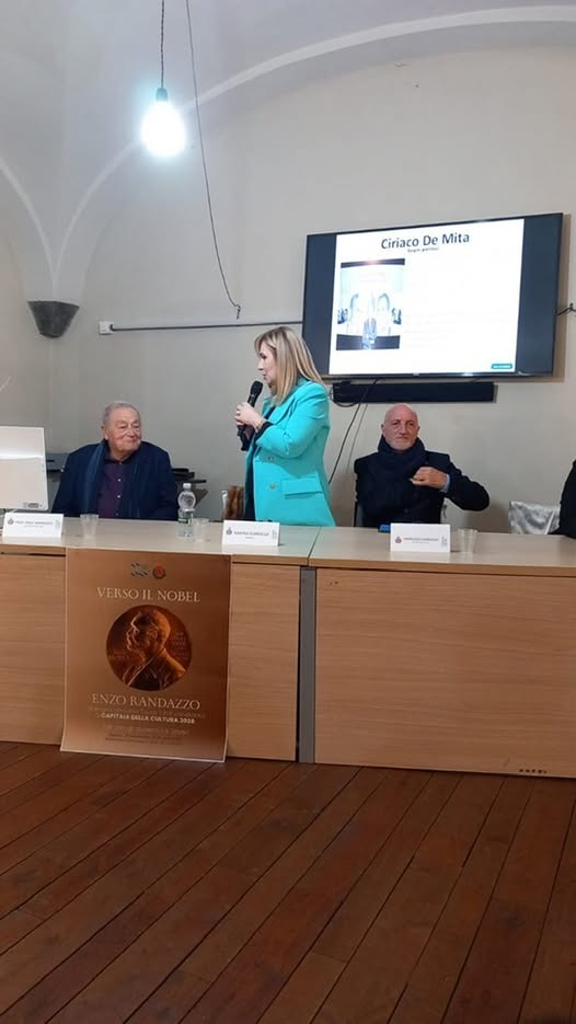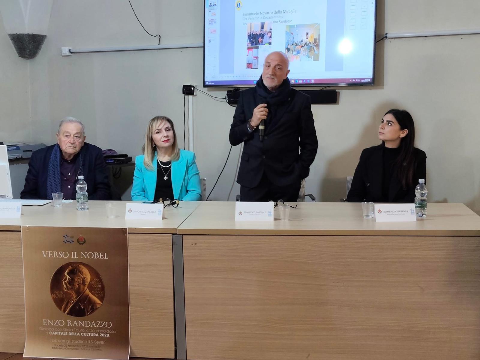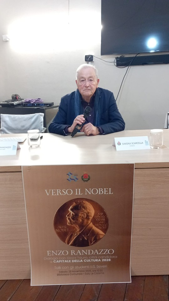 (Gabriella Mondino)—Su invito del Sindaco Dr.ssa Simona Scarcella e dell’Ass. alla Cultura Dr.ssa Domenica Speranza, che hanno anche brillantemente coordinato  la Manifestazione culturale, Enzo Randazzo ha presentato il XVII Premio Internazionale Navarro ed il X Convegno Internazionale di Studi Navarriani alle studentesse e agli studenti dell’Istituto d’Istruzione Superiore “Francesco Severi” e a tutta la Città, accompagnandoli con una Lectio Magistralis su ” Emanuele Navarro della Miraglia, precursore del Verismo e del Pirandellismo”.  Hanno qualificato l’evento con la loro presenza nella Sala Le Cisterne tutte le Autorità politiche e militari rappresentative, i Sindaci dell’Interland, i Presidenti dei Club Lions e Rotary e di numerose altre Associazioni Culturali.  Molto apprezzati anche i puntuali interventi al Talk con Enzo Randazzo di alcuni studenti, della Prof. Cinzia Panuccio, già Premio Navarro 2025, del prof.  Francesco Garofalo, Presidente del Premio Letterario Internazionale L’Eco dei Comuni e delle Comunità di Roma. A conclusione della mattinata, Enzo Randazzo ha fatto dono delle sue opere più recenti alla Biblioteca Comunale di Gioia Tauro.