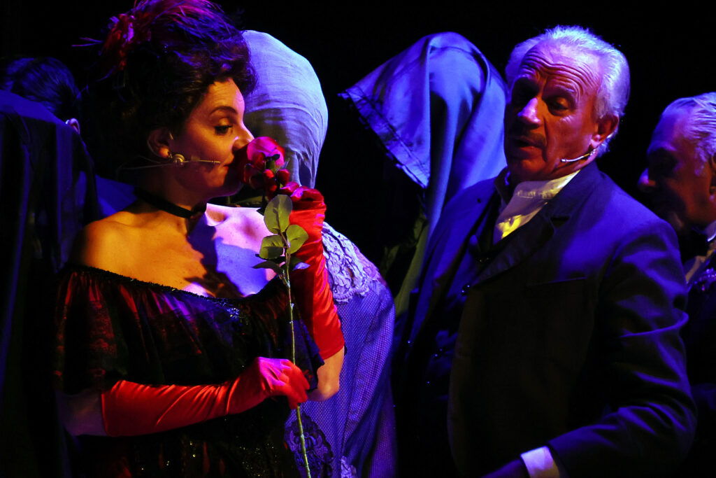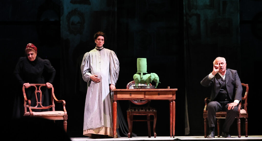 ‘Show, don’t tell‘, tecnica narrativa di derivazione anglosassone e molto usata in cinematografia, è stata ben usata dallo sceneggiatore e regista Giordana, anche se l’ha alternata alle narrazioni dello stesso Mattia Pascal e del sacerdote don Eligio (un impeccabile Totò Onnis). Un ricorso all’esposizione necessario per colmare salti temporali o reminiscenze che si ripetono anche nell’analessi e nella fabula del romanzo. Ne viene una commedia che alterna brani integrali della narrazione a scene ideate radicalmente e ‘mostrate’ come frammenti cinematografici. Il risultato è una rappresentazione che alterna momenti di vivacità e di buona cadenza, a momenti di lenta evoluzione della storia. Se a questa assenza di costanza di ritmo si aggiunge una recitazione spesso meditata del Mattia/Reis interpretati da Geppy Gleijeses, la commedia in certi frangenti diventa monotona, quantunque il mestiere del protagonista cerchi di rompere il tedio con arguzie sottolineate da salti tonali a volte eccessivi (chissà se in questi frangenti solo a noi è venuto in mente Dario Fo).