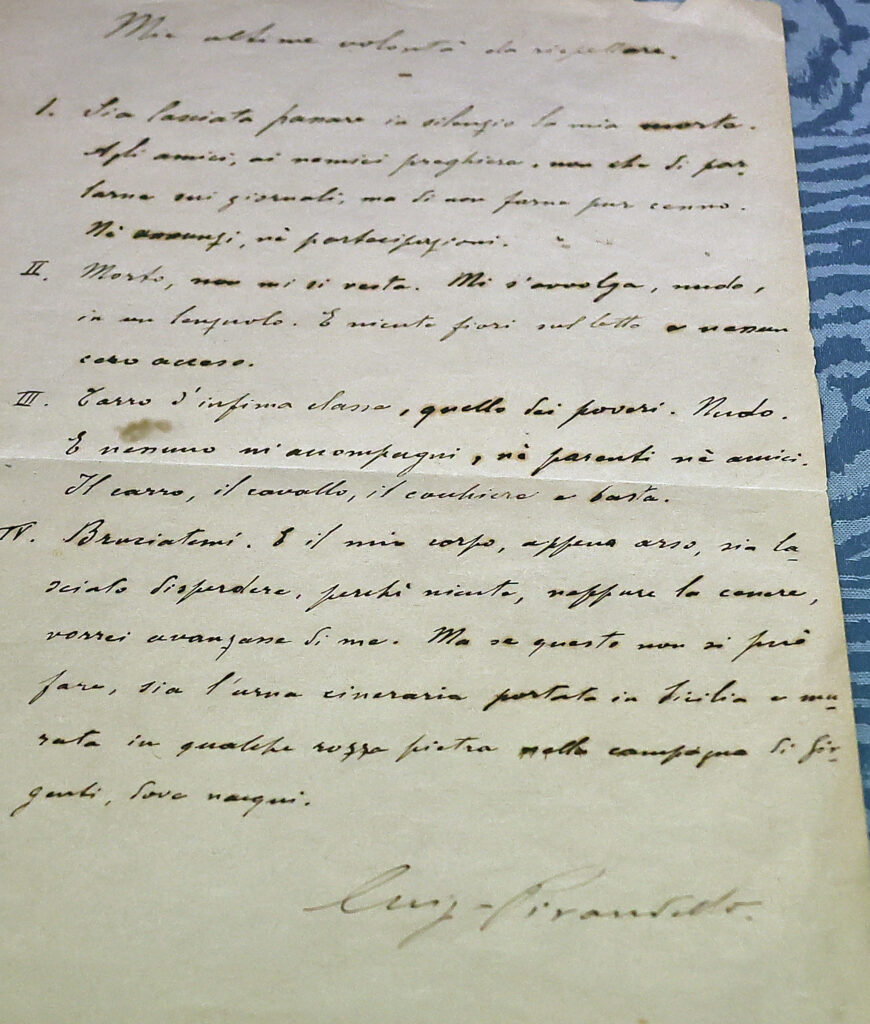 Ottimi miei carissimi, non vi paja strano, son proprio io, io Luigi, io Pirandello, io fratello vostro, io nemico mio, che vi scrivo da Porto Empedocle [Marina di Girgenti], da casa mia, da casa nostra, in mezzo ai nostri…
