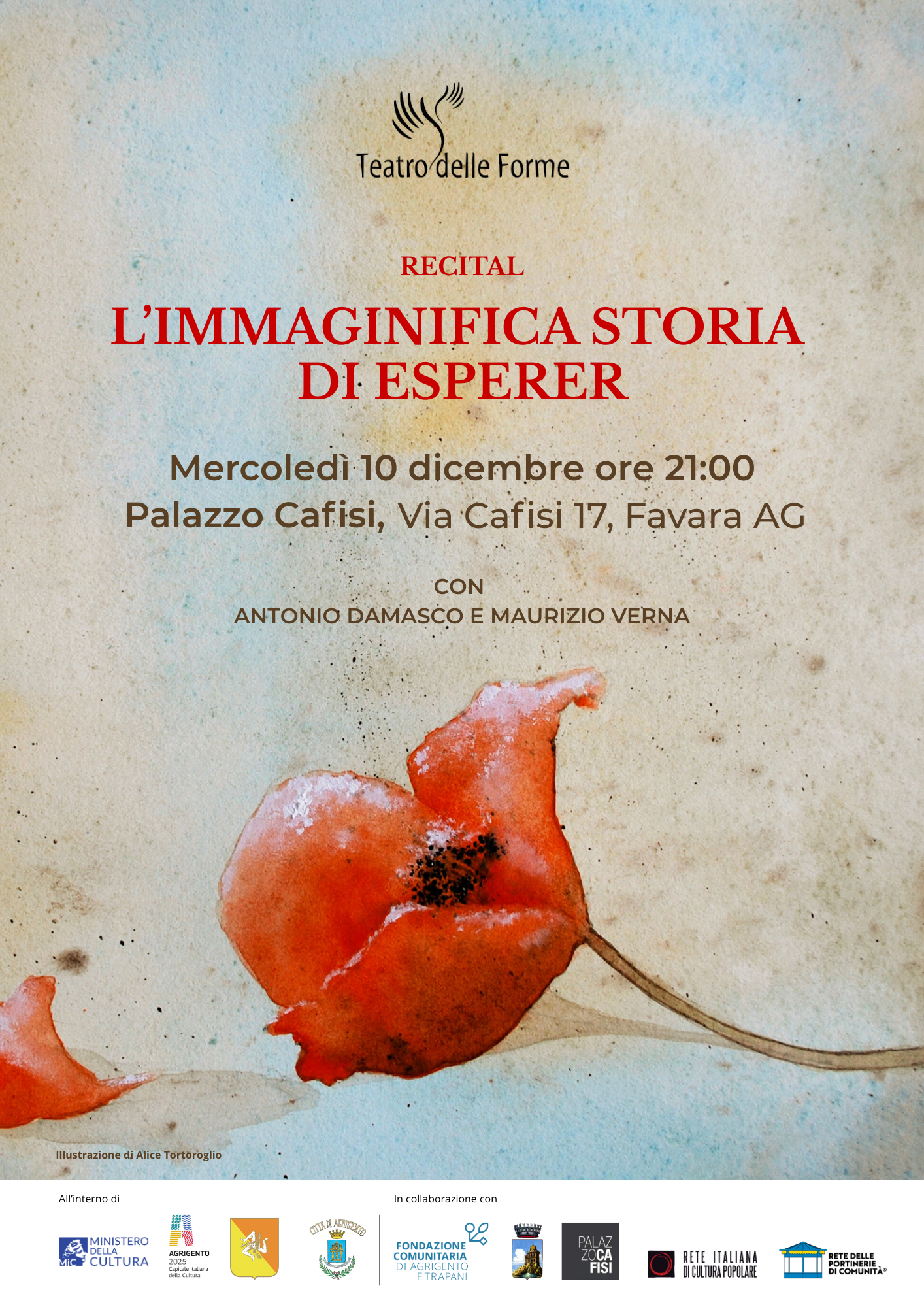 Nel giugno del 2015 un folto gruppo di persone proveniente dai paesi più poveri del continente africano, in transito dall’Italia, fu fermato a Ventimiglia: la Francia chiuse il varco e le famiglie si fermarono sulla linea di confine, riparandosi tra gli scogli per oltre quattro mesi. Da quella esperienza nacque questa favola allegorica, che è diventata un libro e soprattutto, una narrazione teatrale: l’anno scorso “L’immaginifica storia di Espérer” da Lampedusa ha risalito l’Italia fino a Bardonecchia, e ora si è rimessa in cammino: l’attore e drammaturgo Antonio Damasco e il musicista Maurizio Verna portano “L’immaginifica storia di Espérer” domani sera (mercoledì 10 dicembre) alle 21 aPalazzo Cafisi(via Cafisi 17) a Favara, nell’ambito di Agrigento Capitale Italiana della Cultura. L’ingresso è libero.